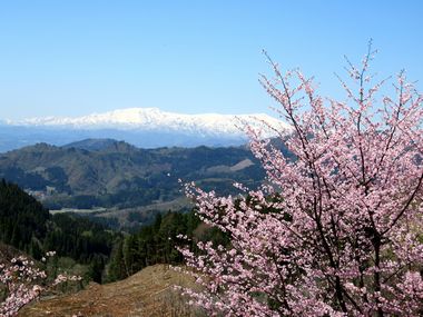 桜が青空に映えますね。遠くの山(飯豊山脈)はまだ雪が残ってます。