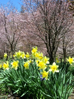 桜の木の下に植えられたスイセン、ムスカリも満開。