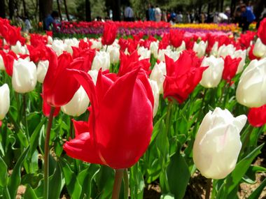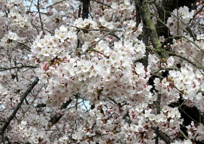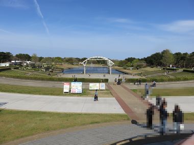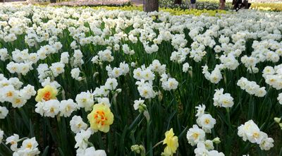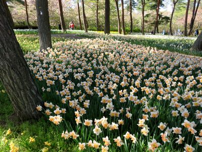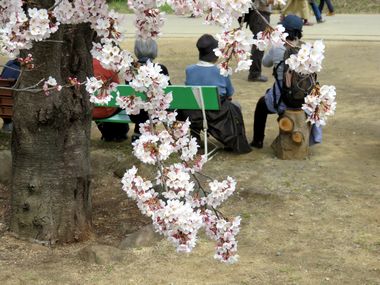 ベンチでくつろぐ花見客。花を眺めながらのんびりするものいいですね。