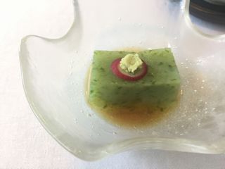 松花堂弁当です。まず最初に先附のオクラ豆腐が出てきました。