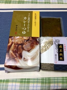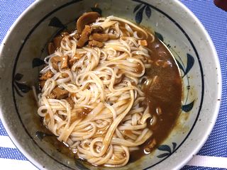 カレーうどんです。つゆは温めて麺は湯がくだけの簡単料理です。