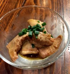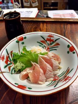 料理は地鶏のとりわさ、鶏もつ時雨煮。