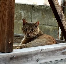 境内の裏手に鎮座。見かけた猫の中で一番大きい子でした。誰かの親かな?