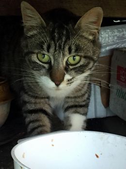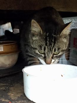 お食事中の猫。中身はカリカリ。こいうの貰ってるんだね。