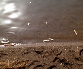 餌のパンの耳がむなしく湖岸に漂着。