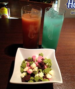 一杯目はチャイナブルーとラズベリーオレンジ。つまみはチョコの盛り合わせ。