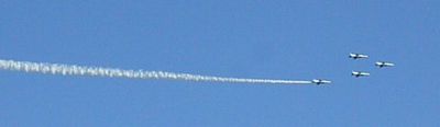 ひこうき雲!!それもこの形は・・・そうです、ブルーインパルスのスモークです。