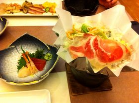 旬のお造り盛り合わせ、焼き玉ねぎのビーフシチュー詰めグラタン
