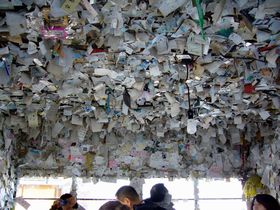 その駅舎には幸せの願いをこめて切符や名刺、メッセージメモなど壁に貼られていました。