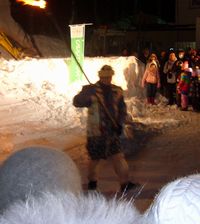 凍った阿寒湖の上で花火が上がる前にアイヌの方による