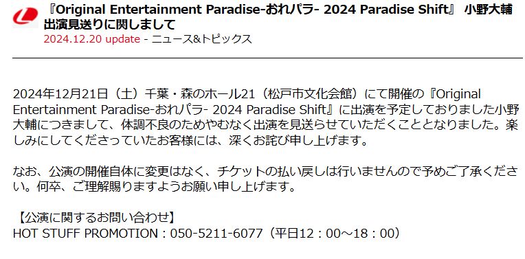 出演を予定しておりました小野大輔につきまして、体調不良のため