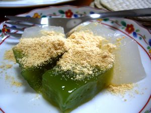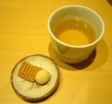 席に着いたらそば茶とあられときな粉の豆菓子です。