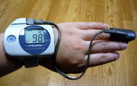 プローブを指先につけて、腕時計のように経皮的動脈血酸素飽和度を