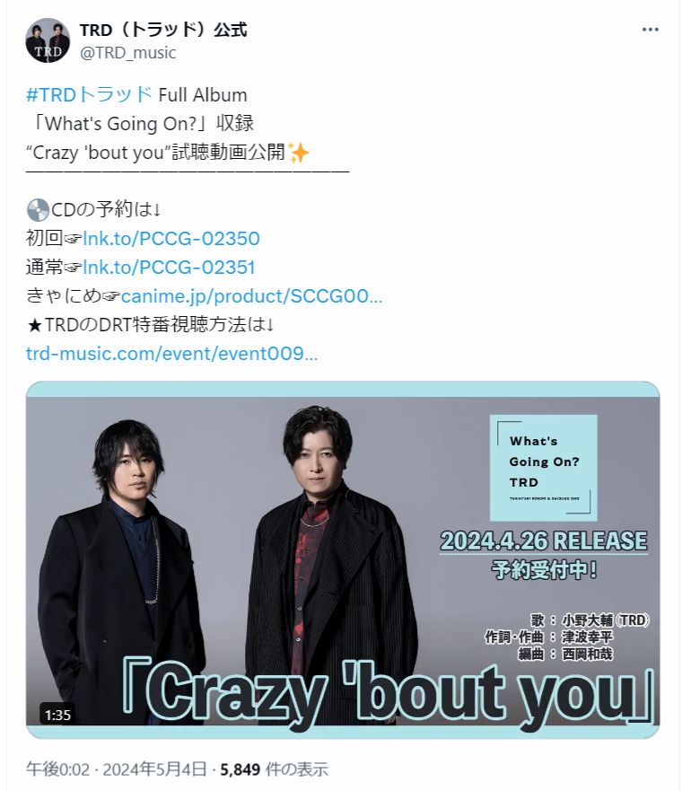小野さんがユニットを組んでいるTRD(トラッド)の公式Xが